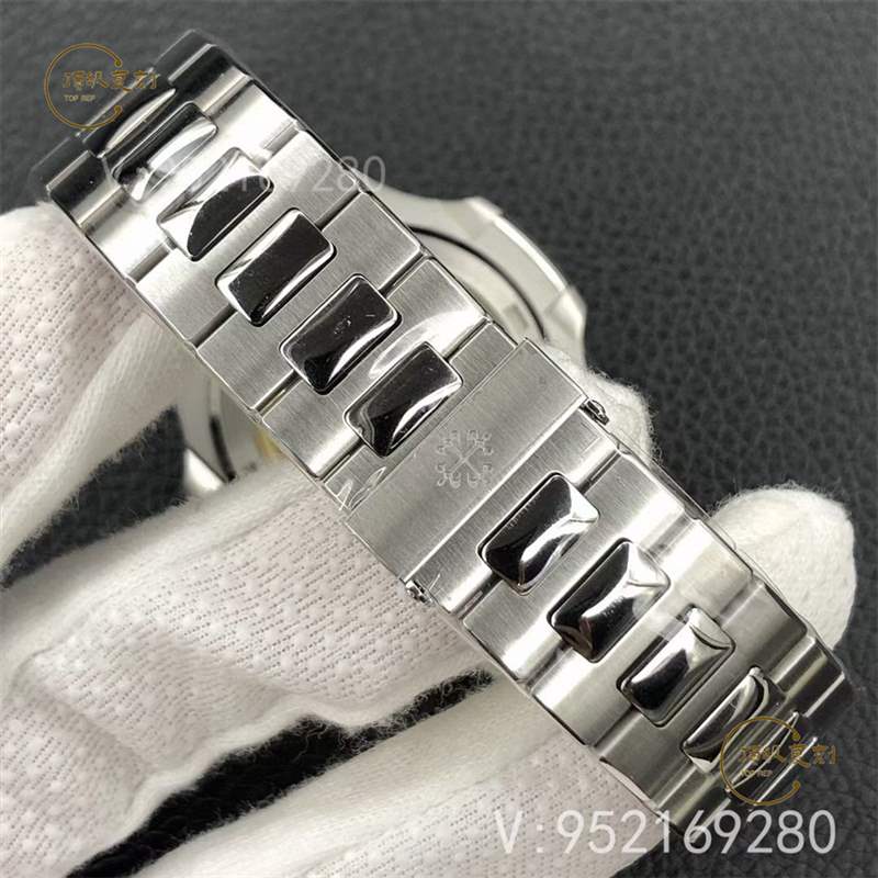 316L精鋼材質打造,整條表帶打磨質感非常不錯,表帶的每一節都有倒角打磨。所以佩戴起來不刮手。Nautilus折疊式表扣。帶fliplock保險扣。打開扣子之后里面的兩排刻字,刻的深度也是一樣的。