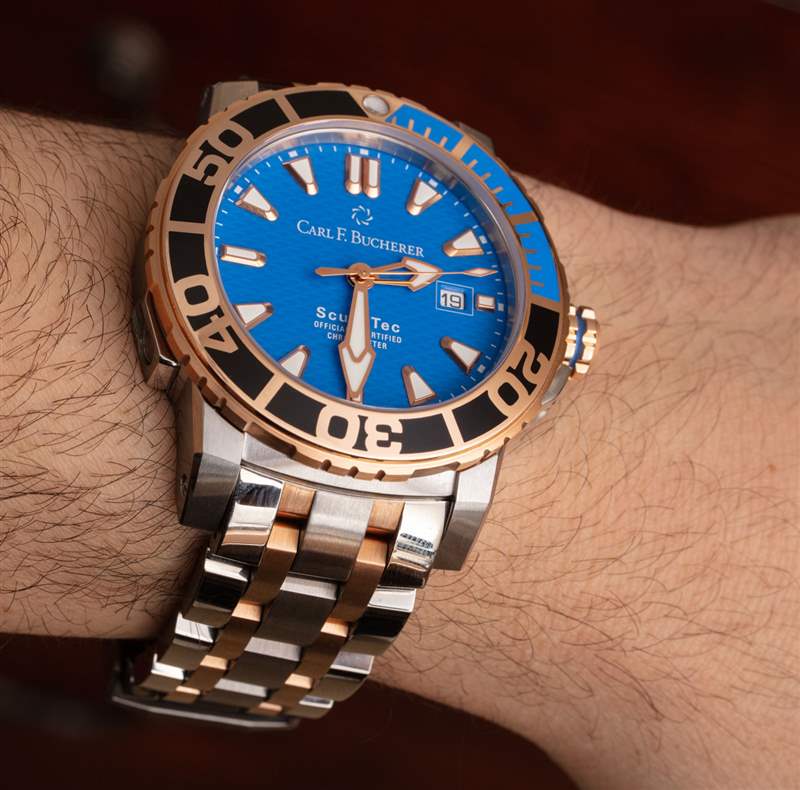 Patravi ScubaTec 是位于盧塞恩的Carl F. Bucherer 的高端潛水表系列。目前最受鐘表愛好者歡迎的就是Carl F. Bucherer款。與許多努力探索新設計的豪華時計一樣,Patravi ScubaTec 在近十年前最初發(fā)布時并沒有立即取得成功。今天,隨著 Carl F. Bucherer 將其大部分營銷重點轉(zhuǎn)移回西方(包括歐洲和美國),Patravi ScubaTec 等型號(此時手表有許多變體)將成為那些時計這將引起很多關注。今天,我回顧了一款帶有亮藍色表盤的雙色鋼和 18k 玫瑰金 Patravi ScubaTec,參考 00.10632.24.53.21。