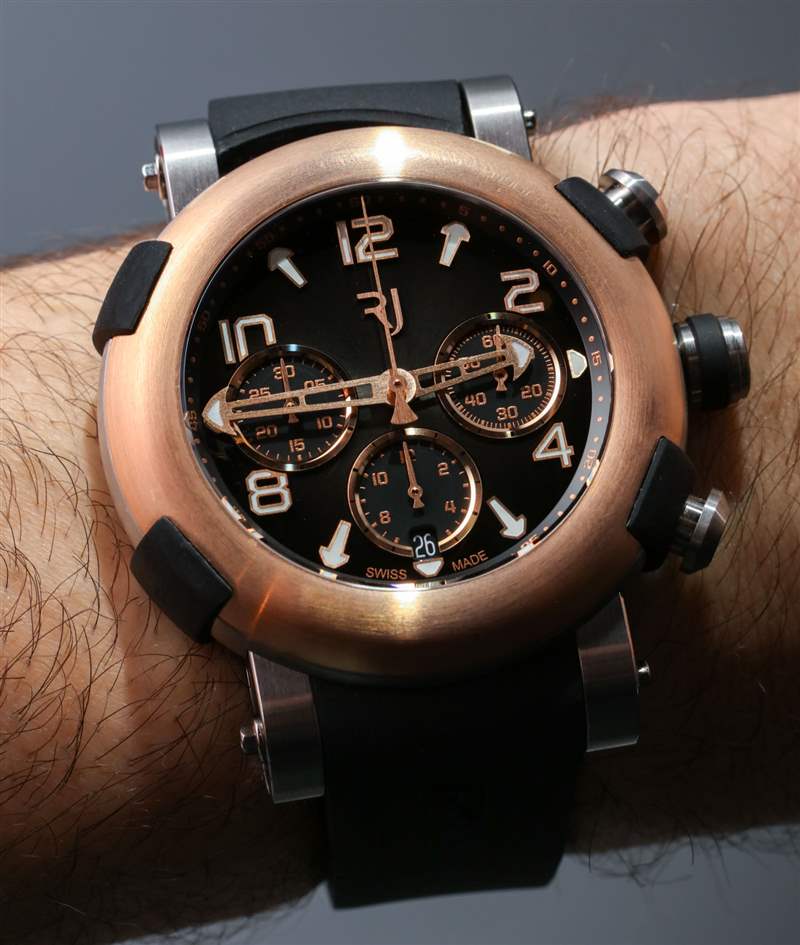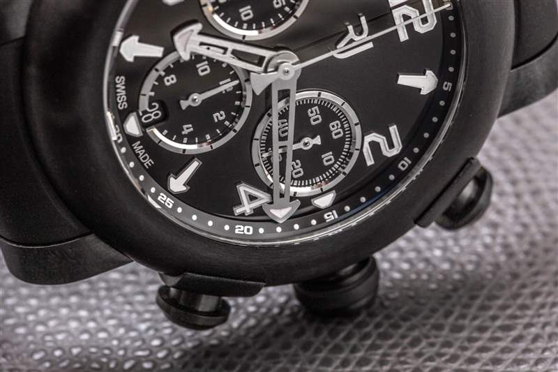 仔細觀察 Arraw 表盤,您會發現其優質的材料和迷人的設計。外觀非常羅曼杰羅姆,但也有舊保時捷設計的元素(RJ在幾年前模仿過)。風格令人愉快,但不像我想要的那樣原始。它還存在易讀性問題,因為鏤空的拉絲指針懸停在許多以相同方式完成的零件上。如今,設計師們似乎完全沉迷于鏤空的手,他們對它們的論點是雙重的。首先,他們說鏤空指針有助于更輕松地閱讀計時碼表子表盤。好吧,我同意這一點,但我提醒他們,大多數人在 100 次中可能有 99 次依靠表盤來讀取時間。因此,考慮到這種用法,重點應該放在讀取時間的易讀性上。第二,設計師只是認為鏤空的手更“現代”。再說一次,這可能是真的,但我不會僅僅因為時尚而給人們積分。