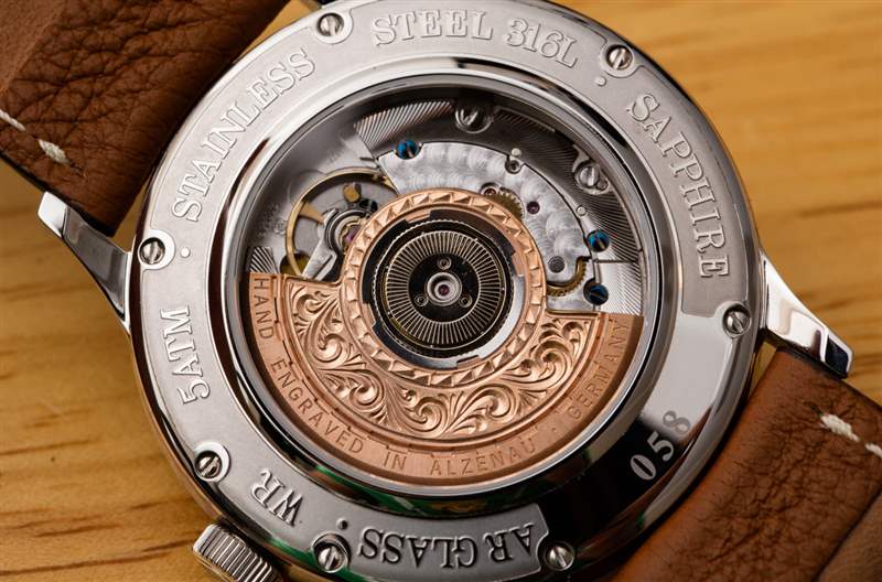 在手表內部,通過手表背面的藍寶石水晶可以看到瑞士 ETA 2892-2 自動機芯。Alexander Shorokhoff 稱其為 2892.AS 機芯,因為增加了定制的自動轉子。從展示的角度來看,這款手工雕刻的黃銅轉子令人印象深刻。Alexander Shorokhoff 明確指出這確實是一個手工雕刻的轉子,而不僅僅是一個經過加工或以其他方式制造(例如沖壓)的具有這種外觀的轉子。轉子本身上寫著“Hand Engraved In Alzenau, Germany”。