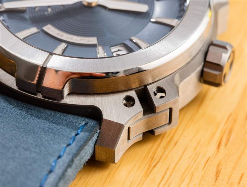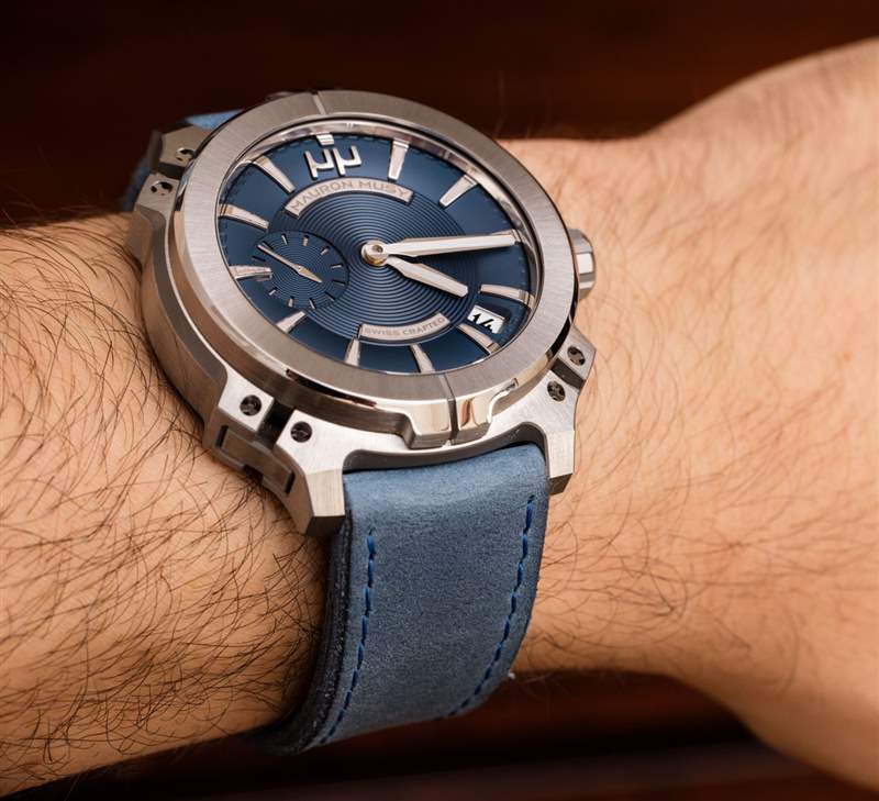 Armure MU03 表殼寬 44 毫米,非常突出,但我不會稱它為超大號。精心加工和拋光的鈦金屬表殼戴在手腕上看起來很棒,Mauron Musy 制作了一個特殊的表殼來模仿表盤上表殼的視覺效果。這家公司真的希望您注意它對金屬的加工能力——而 Armure 系列旨在體現(xiàn)其對精細金屬拋光的癡迷。全金屬表盤包括應用時標(每個都經(jīng)過復雜的鉆石拋光處理),以及指針和裝飾表盤(此處為藍色)。癡迷的人會喜歡表盤有一個全尺寸的 9 點鐘指示器,盡管在那個位置有一個輔助秒盤(指針掃過時標中間的一個切口)。
