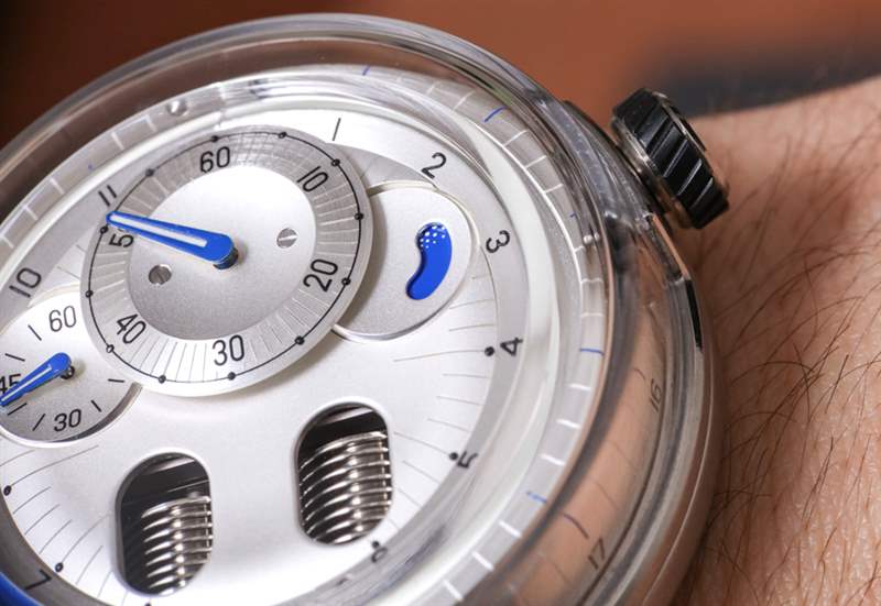穿著尺寸很大,但就像我說的,舒適。無表耳的表殼設(shè)計有助于其佩戴小巧,但 H0 表殼仍然是 48.8 毫米寬和 17.9 毫米厚。大部分表殼覆有碗形藍寶石水晶鏡面,表背為緞面拉絲鈦金屬。讓設(shè)計更有趣的是手表的表盤也是碗形的,頂部的水晶在H0中看起來像是一種與大多數(shù)其他手表截然不同的結(jié)構(gòu)裝置。因此,水晶不僅是看表盤的地方,也是表殼結(jié)構(gòu)的重要組成部分。