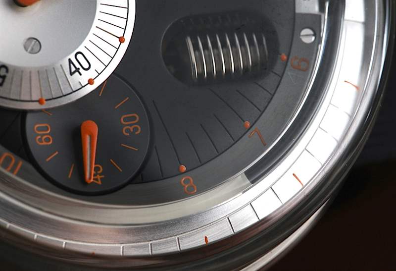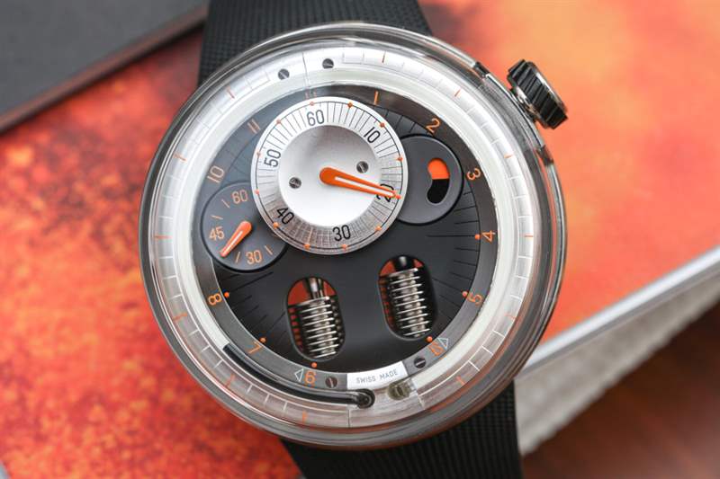 假設(shè)表盤顏色正確,大多數(shù) HYT 手表的時間顯示布局也非常清晰易讀。至少我發(fā)現(xiàn) HYT H0 Silver 就是這種情況,我在本次評測中與 H0 Orange 一起評測了它。我仍然不知道為什么 HYT 決定使用“0”名稱。為什么不選擇 HYT H5 或類似“H1 Neo”之類的東西呢?也許稱之為H1.5。這款手表可能有一個全新的表殼,但為什么要使用 0 作為名稱的一部分呢?我們要回到過去嗎?看起來它被稱為“Ho”的手表值得嗎?無論名稱如何,H0 腕表系列都給人耳目一新的感覺,并且很好地利用了 HYT 在其五年生命周期中開發(fā)的技術(shù)和視覺主題。