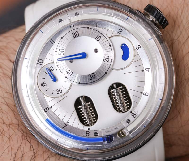 提醒您,HYT 最初是“流體機械鐘表師”。如果你不知道那是什么意思,那沒關(guān)系。這里的含義是所有 HYT 手表都使用液體作為機械機芯顯示時間的方式的一部分。藍寶石水晶“毛細管”管系統(tǒng)充滿有色液體。液體沿著管子移動以指示分鐘,由波紋管系統(tǒng)提供動力,該系統(tǒng)使用兩個波紋管式腔室來移動液體的相對位置。該系統(tǒng)已被證明是相對穩(wěn)健且具有視覺吸引力的。因此,您可以看到管道系統(tǒng)的幾乎整個圓圈,它運行一個很長的“小時”指示器軌道。其他表盤用于分、秒和機芯動力儲存指示。廣告訊息廣告信息結(jié)束