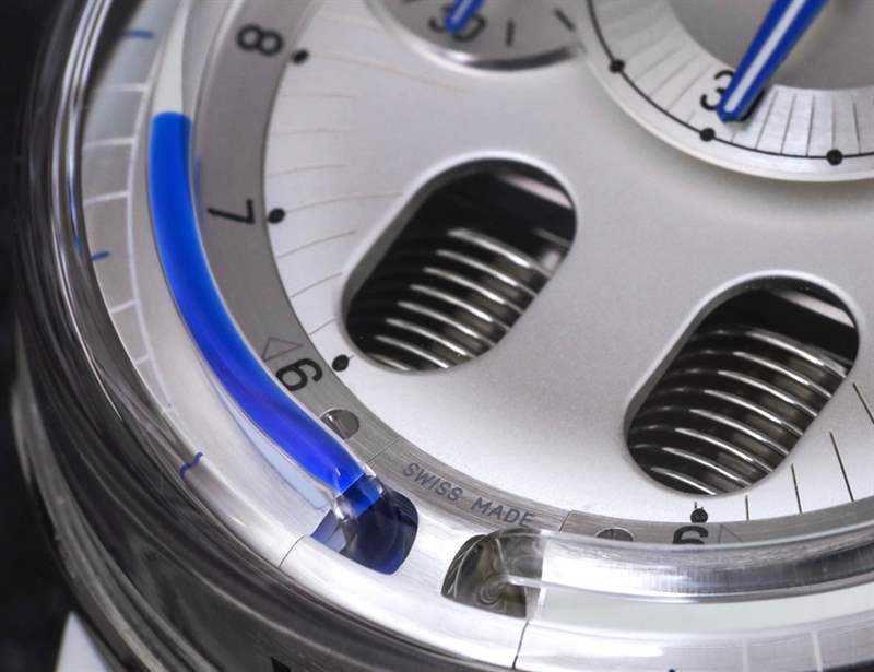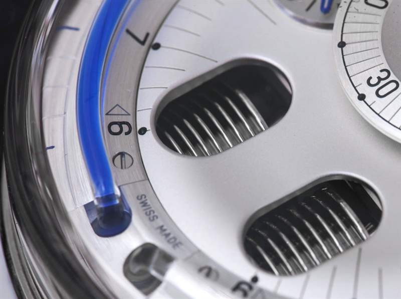 您可以從表殼側(cè)面讀取表盤的小時部分,上面有 24 小時標記,它不太有用,但提供了更多功能。正上方是藍寶石水晶管,里面裝有時間指示液體以顯示小時。在 H0 Silver 中,液體是可愛的藍色,H0 Orange 為黑色,H0 Black 為綠色。綠色和藍色的流體顏色是最清晰的。值得一提的是,發(fā)光體是如何應(yīng)用到表盤上的。毛細管下面有一條發(fā)光體(很酷),還有傳統(tǒng)手上的發(fā)光體。