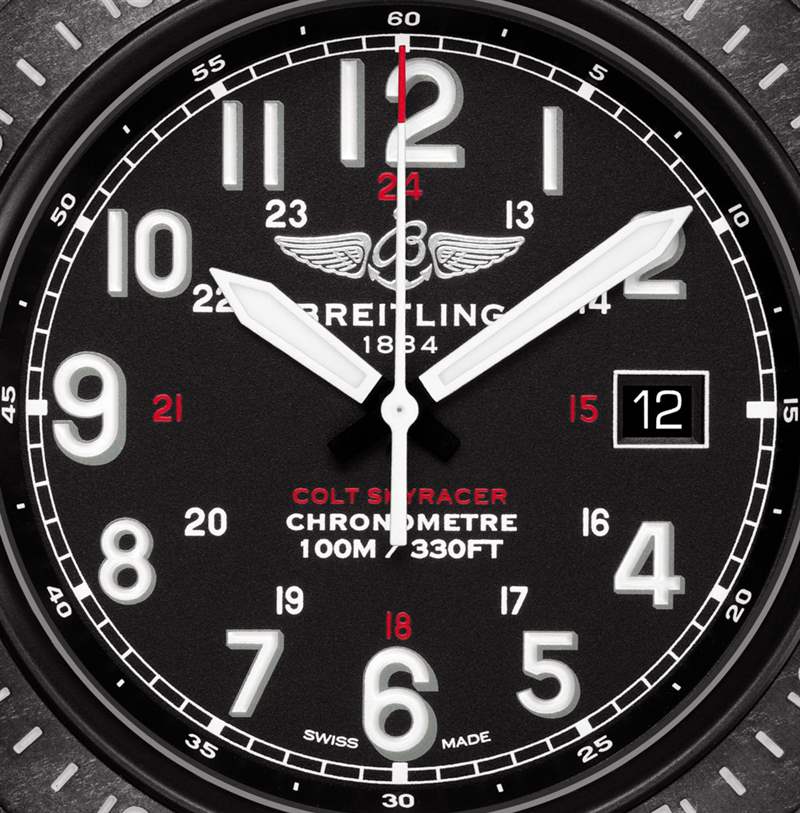 百年靈 Colt Skyracer 的表盤易讀性非常好。夜光指針和標志性的阿拉伯小時數(shù)字既合理又不會太嚴肅。我很喜歡百年靈能夠在設(shè)計中融入健康的個性——這對于奢侈手表來說很重要,因為人們選擇購買它們總是有一個獨特的元素。表盤上還有一個專用的 24 小時軍用時間刻度以及一個日期指示器窗口。這是保守的工具表盤的一個很好的例子,它也設(shè)法不乏味。