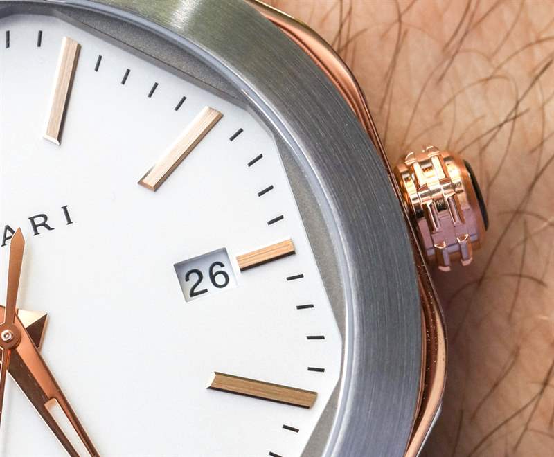 58 面表殼(再次)寬 41 毫米,防水深度達 100 米,帶有旋入式表冠(其中有一個小陶瓷嵌件)。表盤顏色有黑色、棕色和銀色,還有一些鋼色和金色兩種顏色可供選擇。雙色調的寶格麗 Octo Roma 很有趣,因為表殼的中心環是金色的,而其余的是鋼制的。這是一個非常聰明的設計,雖然它不會以任何方式取代原來的 Octo,但寶格麗通過 Bulgari Octo Roma 有意義地增加了該系列。