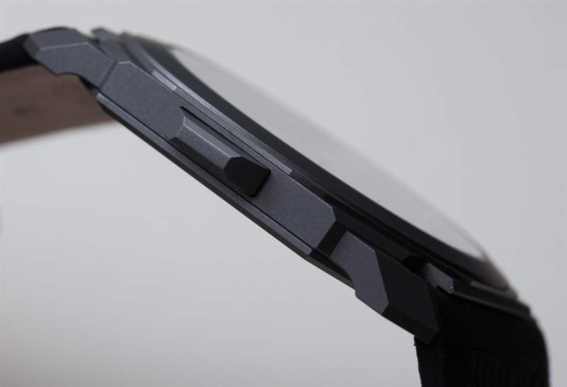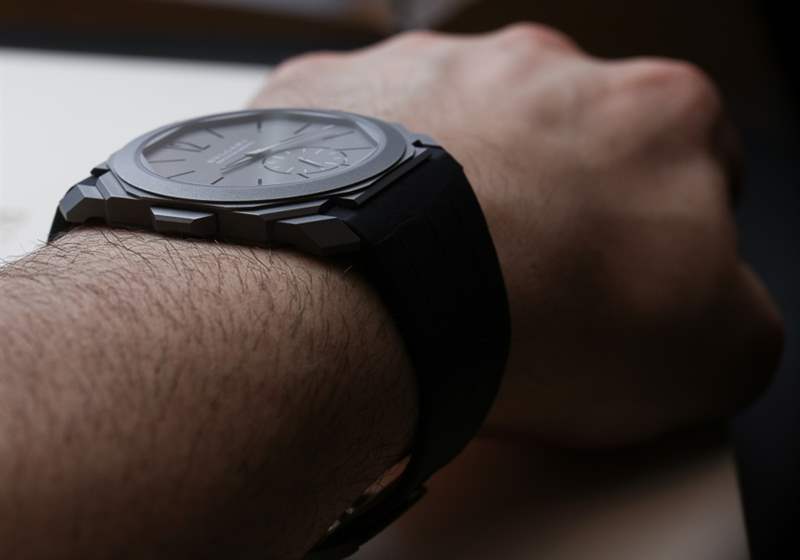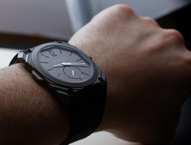 那么讓我們談談尺寸,因為這是一款破紀錄的手表。Bulgari Octo Finissimo 三問報時表殼厚 6.85 毫米,寬 40 毫米,采用涼爽的噴砂鈦材料制成。表冠也是鈦金屬,但經過拋光處理并鑲嵌有黑色凸圓形陶瓷。這比之前創下“最薄三問報時表”記錄的Vacheron Constantin Patrimony Contemporaine Calibre 1731 Minute Repeater 薄了超過一毫米,后者于 2014 年記錄了大約8.09 毫米厚的表殼。廣告留言廣告信息結束