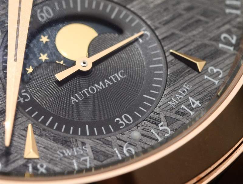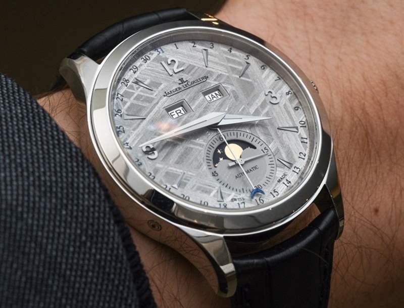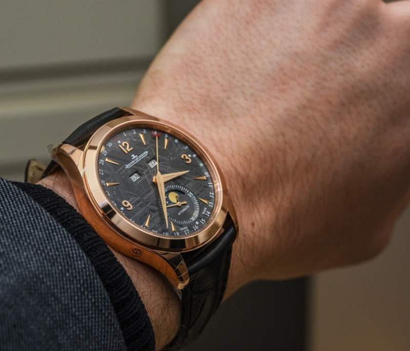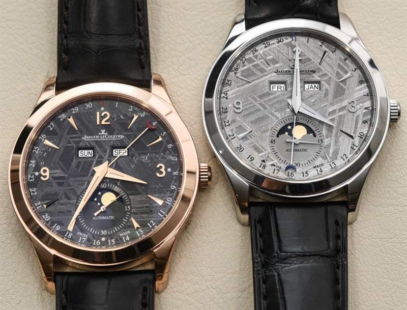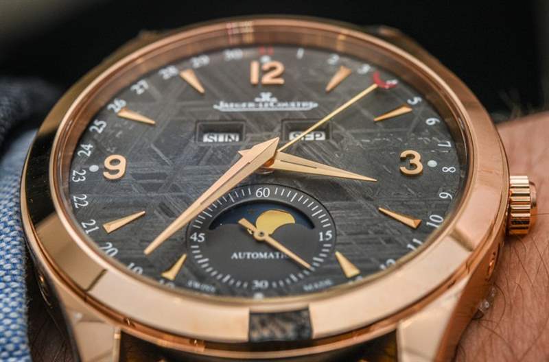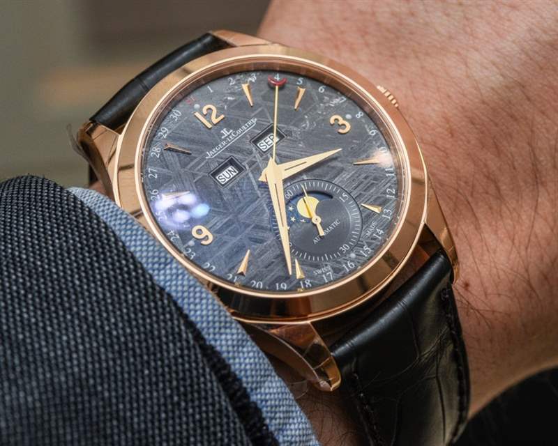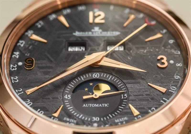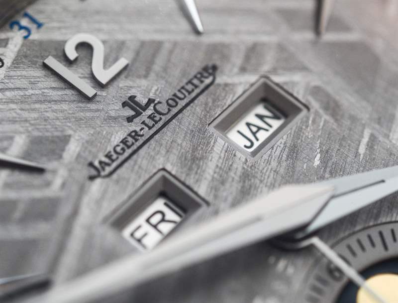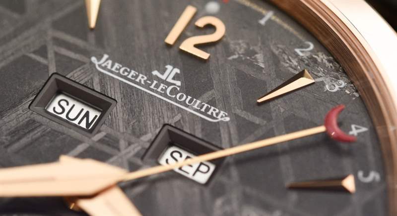 當(dāng)然,積家也推出了無(wú)隕石表盤的精鋼或18k玫瑰金萬(wàn)年歷腕表,搭配鍍銀表盤。那些看起來(lái)不錯(cuò),但隕石增加了視覺(jué)趣味,使時(shí)計(jì)更加獨(dú)特,在我看來(lái),引人注目。一個(gè)合理的問(wèn)題是“隕石表盤的溢價(jià)是多少?” 任一版本的答案都是 2,300 美元。因此,從標(biāo)準(zhǔn)的鍍銀表盤 Master Calendar 到 Jaeger-LeCoultre Master Calendar Meteorite 的成本要高得多。合理的價(jià)格?它并不便宜,但我想在隕石上打印更復(fù)雜,就像應(yīng)用指示器和切割它一樣。最重要的是,隕石是一種稀有礦物,因此它的價(jià)格當(dāng)然會(huì)高于標(biāo)準(zhǔn)金屬表盤。