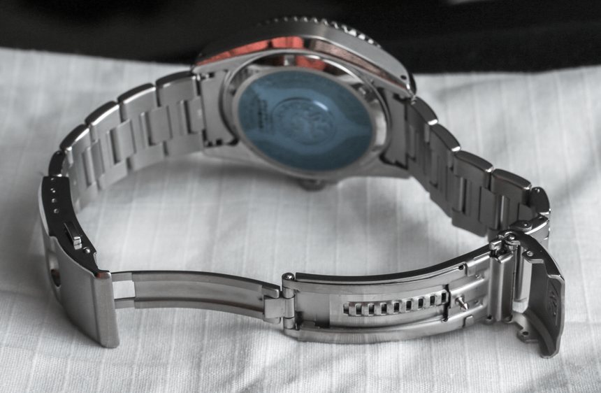 附在表鏈上的是 Seiko 出色的棘輪式潛水擴展裝置,它提供了許多易于使用的微調功能。它頂部有一個堅固的折疊表扣,再次浮雕“GS”Grand Seiko 標志。您可以使用這個扣環來改變手鏈的微調——甚至可以在手鏈還在手腕上時進行調整。