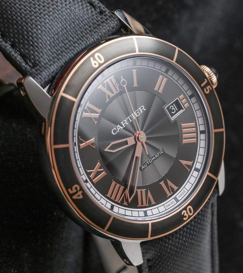 Cartier Ronde Croisiere 的表圈設計看起來像旋轉的潛水員表圈,但它是固定的。精鋼表圈采用 ADLC 黑色啞光涂層,賦予其獨特的外觀。這在鋼和金型號上非常有效,在表圈和 18k 玫瑰金表冠上增加了一些 18k 玫瑰金鍍層。黑色尖晶石用作表冠的凸圓形材料,與許多其他卡地亞手表更常見的藍色藍寶石水晶形成鮮明對比。皇冠非常符合卡地亞設計 DNA 的范圍。