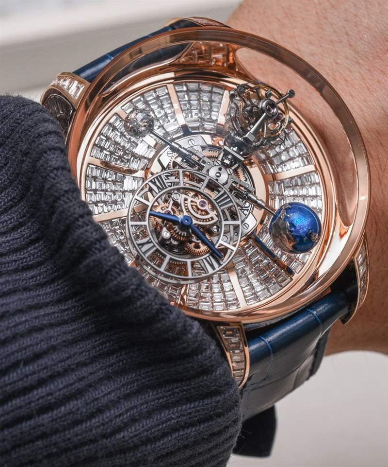 陀飛輪系統本身還有另外兩個軸點,每 60 秒旋轉一圈,然后每 5 分鐘轉向不同的方向。陀飛輪對面是一個時間表盤,它非常酷,因為無論它圍繞表盤旋轉到哪里,它都指向直立。我就是喜歡那個。然后是帶有微型手繪鈦球體的手臂,在它的對面是一顆“Jacob 切割”鉆石,該鉆石采用 Jacob & Co. 獨有的注冊工藝,使鉆石具有球形表殼和 288 個刻面。地球儀和鉆石迪斯科球每 60 秒旋轉一圈。