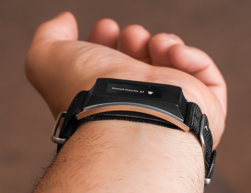黑色鋼制單元是一個模塊,可以滑到位于手腕下方的特制堅韌但非常薄的北約風(fēng)格表帶上,而傳統(tǒng)手表(本例中為萬寶龍時光行者)則位于手腕上方。該模塊有一個屏幕,包括內(nèi)置傳感器,并與您的手機通信。它提供了接收電話通知、跟蹤健身活動以及執(zhí)行其他越來越流行的標準“智能手表功能”的能力。此舉巧妙而簡單,單色 OLED 屏幕既不會讓人分心,也不會讓人覺得不受歡迎。