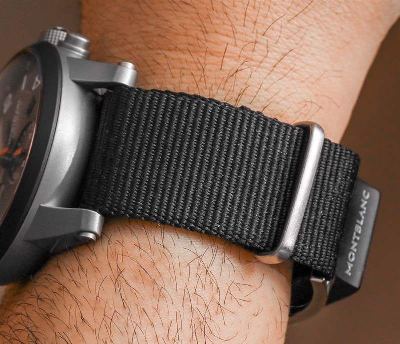 盡管萬寶龍打算讓萬寶龍 e-Strap 適合各種表帶(最終),但他們創(chuàng)造了一種特殊的北約風(fēng)格皮革表帶,以配合 Timewalker Urban Speed 手表系列的發(fā)布。請注意,它并不是 Timewalker Urban Speed 手表可用的唯一表帶選項。用于固定萬寶龍電子表帶的表帶采用具有科技感的碳纖維圖案皮革制成,非常薄,側(cè)面有一個帶扣。總而言之,我認為表帶和萬寶龍電子表帶的組合效果很好。