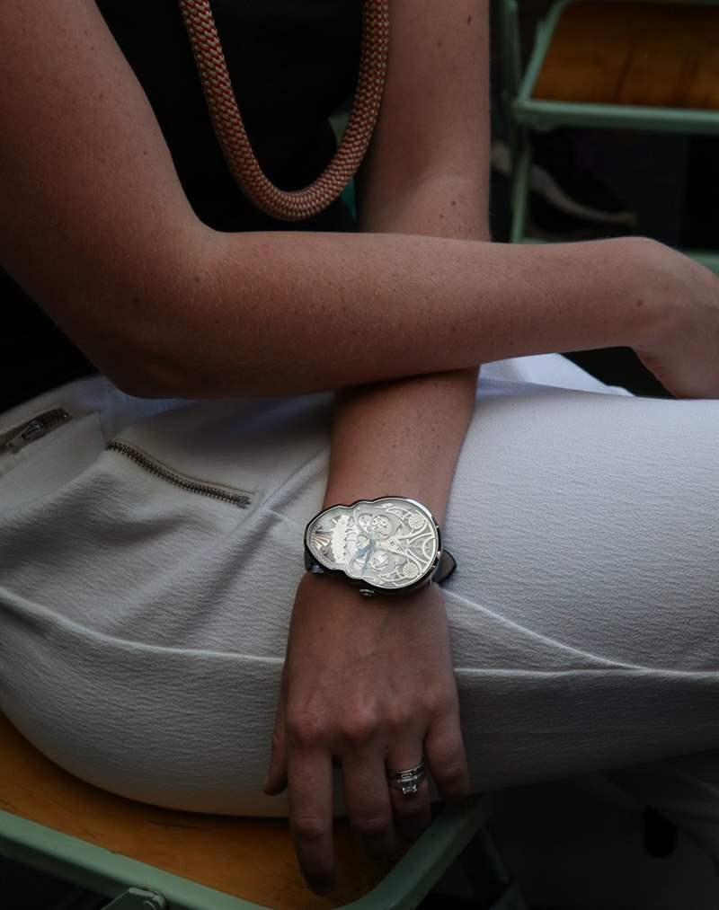 在最初撰寫有關(guān)她的 Memento Mori Skull 手表的近三年后,我親自會(huì)見了設(shè)計(jì)師Fiona Krüger,親眼目睹了由此產(chǎn)生的時(shí)計(jì)。她的故事很有趣,那些想在奢侈品行業(yè)發(fā)家致富的人可以從她的過程中學(xué)到很多東西。當(dāng)她還是瑞士 ECAL 藝術(shù)學(xué)校的學(xué)生時(shí),她想出了她的 Memento Mori 手表的設(shè)計(jì)。雖然她不是墨西哥人,但她確實(shí)在墨西哥生活過一段時(shí)間,并受到圍繞亡靈節(jié)慶祝活動(dòng)的多彩有趣和明顯病態(tài)美學(xué)的啟發(fā)。結(jié)合歷史悠久的歐洲鐘表制作的一些元素,這款獨(dú)特的骷髏形腕表誕生了。