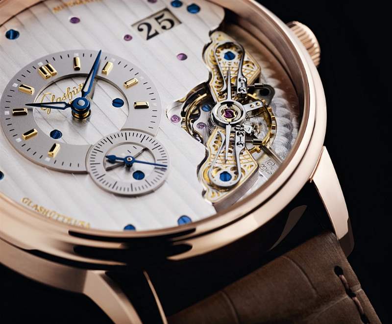 表盤(pán)配有藍(lán)鋼螺絲和紅寶石,看起來(lái)就像是機(jī)芯的一部分。我有一種感覺(jué),這些元素不僅僅是裝飾性的,盡管如果其中一些是裝飾性的,我也不會(huì)感到驚訝。當(dāng)然,手表的重點(diǎn)在于表盤(pán)式擺輪和擒縱裝置。它們以完整的 Glasshute Original 風(fēng)格生產(chǎn),配備雙鵝頸微調(diào)系統(tǒng)以及手工雕刻的擺輪夾板。做得很好,很高興看到。