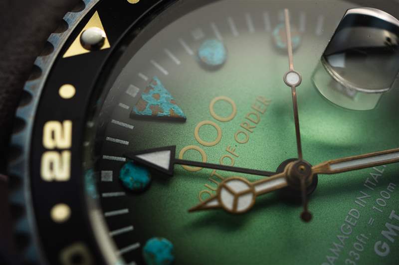 Out of Order Oxidized Green GMT New York 從自由女神像的氧化銅中汲取靈感——可以在底蓋上找到——帶有充滿活力的祖母綠表盤,在深黑色的環(huán)繞中漸暈。帶紋理的綠色銅銹在所應(yīng)用的時(shí)標(biāo)上完美呈現(xiàn),層層疊疊的銅綠色讓位于下方銅的光澤。這些相同的時(shí)標(biāo)也出現(xiàn)在 Very Blu GMT New York 上,雖然它們與這個(gè)版本的藍(lán)色主題不太相配,但白色的夜光周圍有助于提高易讀性。