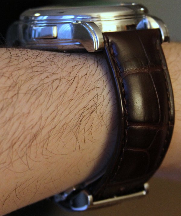 Nicolas Rieussec表殼寬43毫米,高14.8毫米。它不是一塊小手表,但它確實像中型手表一樣佩戴。高度彎曲的凸耳在視覺上降低了它的高度。前后水晶均為藍寶石(前水晶有雙AR涂層),防水深度達30米。