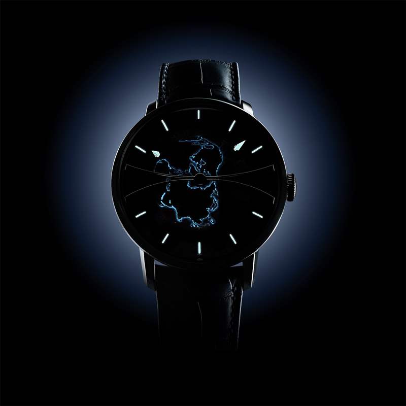 45mm鉑金表殼特別適合襯托藍(lán)色地球表盤(pán),表盤(pán)中央地球盤(pán)經(jīng)過(guò)鍍銠和拋光處理,綿延的山脈以磨砂工藝突出,微繪海洋的顏料中添加珍珠母貝粉,賦予海面波光粼粼的迷人質(zhì)感,海岸線則涂繪熒光材料,黑暗中亦能看見(jiàn)陸地輪廓。