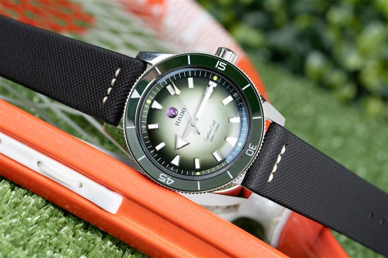 卡梅倫·諾里 (Cameron Norrie) 庫克船長 (Captain Cook) 的表盤是這一切的集大成者。這就是 Norrie 和 Rado 享受樂趣的地方。您擁有標準的大箭頭時針(加上網球黃色秒針尖端)和所有庫克船長腕表上都有的應用標記,以及相同的表盤文字和精美的紅色文字日期輪。這一切都很棒,您不會聽到我對 Super-LumiNova 的易讀性和亮度提出任何抱怨。Norrie 版本將北約 (NATO) 的白色和綠色圖案與表圈融為一體,引入了從白到綠的漸變,最終形成深綠色的章環。