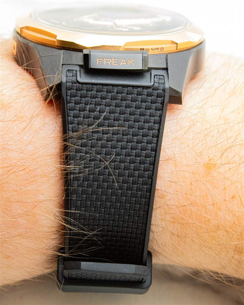 為了完善 Freak ONE 時尚且(相對而言)微妙的黑金外觀,雅典表為這款腕表搭配了簡約黑色的紋理織物效果橡膠表帶。雖然這條表帶柔軟且相當舒適,但可以說它缺乏其他設計的一些特色。然而,作為 Freak ONE 奇特之處的最后一層,這條表帶以相反的方式安裝,唐扣末端位于 6 點鐘位置。表面上這樣做是為了在 6 點鐘表殼一側的“Freak”銘牌上留出一個凹口,但它確實增強了佩戴者的感覺,雅典表憑借這款腕表隨著自己的鼓點起舞。