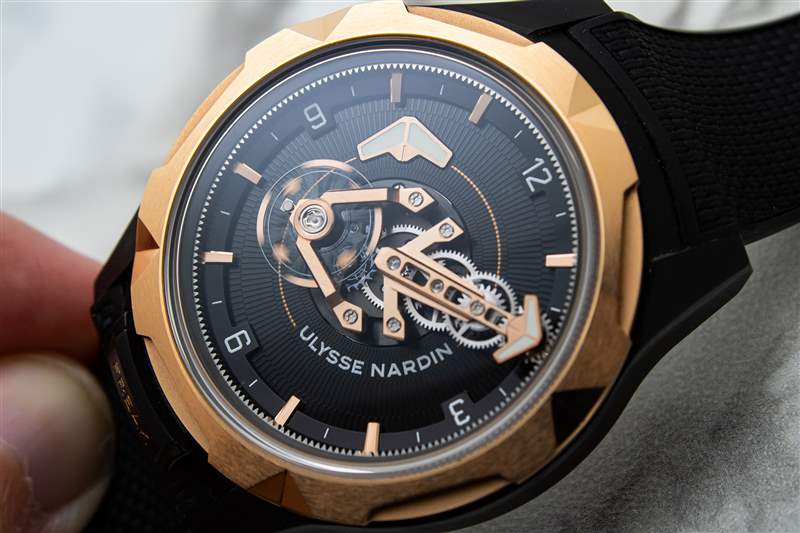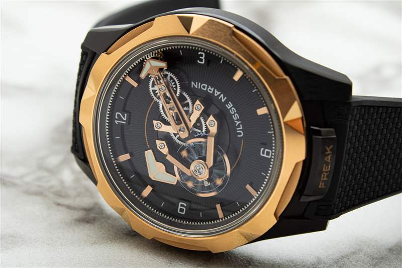與之前的 Freak 型號一樣,Ulysee Nardin Freak ONE 的表殼具有一個一眼就能識別的特征——沒有任何表冠,從而形成了完全對稱的表殼輪廓。然而,從那時起,Freak ONE 與其前輩們有了很大的不同。除了無表冠的設計外,這款 DLC 涂層鈦金屬和 18K 紅金表殼相對于一些高級鐘表而言顯得比較樸素,幾乎顯得古板競賽。表耳是經典的運動錐形,帶有狹窄的拋光倒角和干凈的線性拉絲,除了沒有表冠之外,表殼側面是經典的垂直板。簡而言之,Ulysse Nardin Freak ONE 戴在手腕上就像一塊普通的手表。44 毫米寬的它可能并不小,但絕對不做作,特別是由于輕質鈦金屬和纖薄黑色的結合。當考慮到普通表冠的尺寸時,Freak ONE 佩戴起來更像是一款 42 毫米寬的手表,而 12 毫米厚的表殼輪廓則強化了手腕上“普通運動手表”的比例。廣告留言廣告信息結束