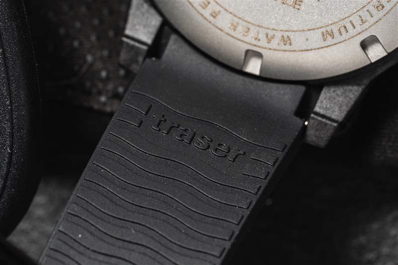 Traser P99 Q Tactical 是一款不小的手表,但戴在我 6.5 英寸的手腕上并不笨重(如上圖所示)。盡管尺寸較大,但混合表殼結構和黑色碳纖維強化外殼的纖薄特性使其佩戴起來異常舒適。搭配的橡膠表帶重 100 克,也使其成為其他類似尺寸手表的輕巧替代品。這種較大的尺寸還可以防止它滑到襯衫或夾克的袖口下面,與大多數手表相反,這在緊急醫療領域是首選。在大多數情況下,戴著臟手套將袖帶向后滑動來檢查時間并不理想。然而,帶有棱紋的表圈很容易被任何類型或任何污垢量的手套抓住。雙向 60 次點擊邊框是一個令人愉悅的功能補充。雖然傳統的潛水表圈是單向的,但現場使用設備的多功能性和適應性受到贊賞。如果我要改變邊框的一件事,那就是可以選擇更換其他刻度以滿足任務要求。