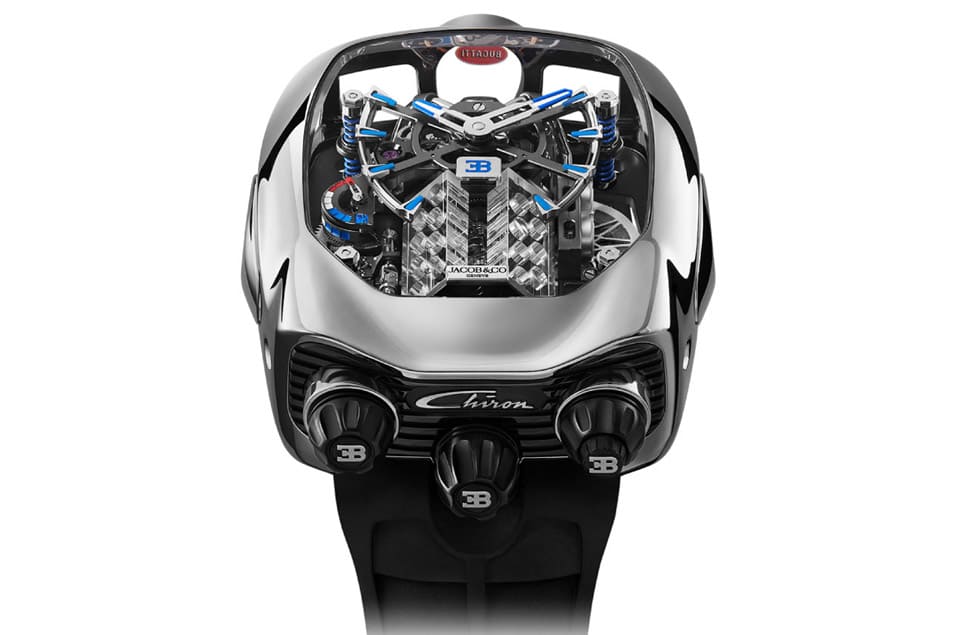 Chiron Tourbillon顧名思義設計靈感來自布加迪的超跑Chiron,雖然它的功能復雜度達到陀飛輪等級(還是品牌首見的傾斜30度飛行陀飛輪),但是手表真正讓人驚嘆的部分反而在于立體面盤下半部的仿超跑引擎活塞與曲軸設計,佩戴者只要按下右側的按把,這時曲軸會開始旋轉、活塞也會開始上下作動,豪邁的視覺效果猶如正在加速沖刺的超跑, 令人看得嘆為觀止。